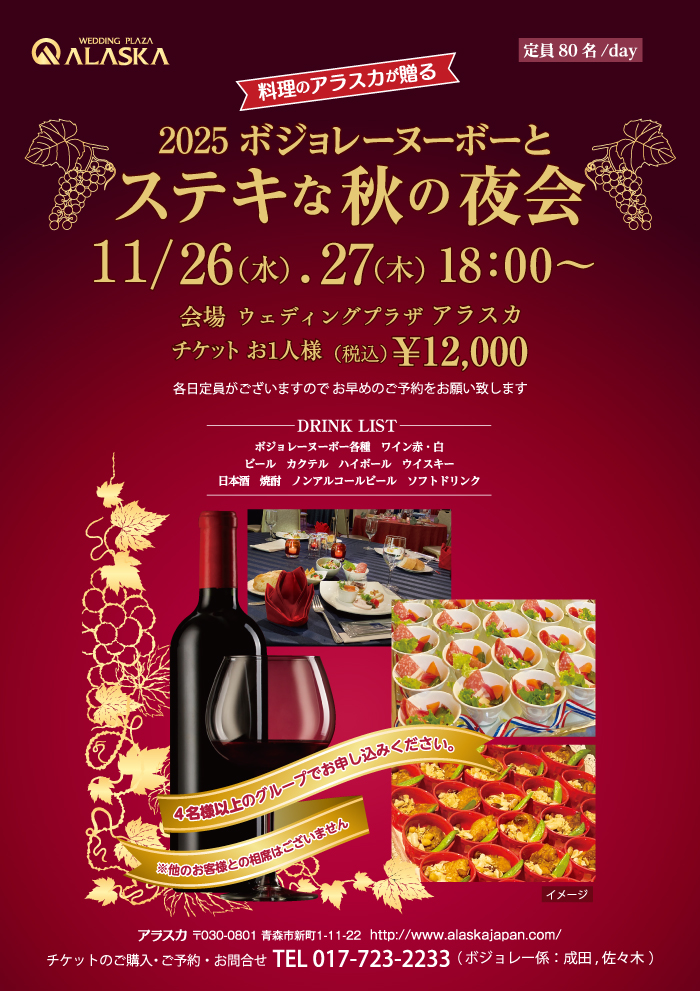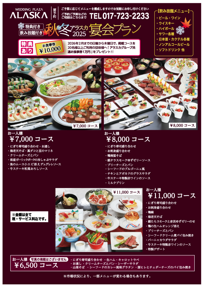 2025〜2026 飲み放題付きアラスカ秋冬宴会プラン ご予約承り中!!